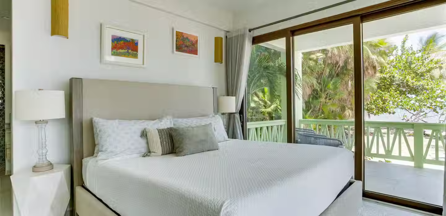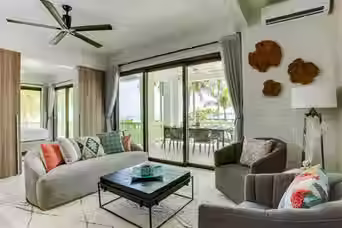 Villa 112 provides over 1,500 square feet of modern, beautifully decorated living space. Modern kitchen with large fridge and private BBQ. The design is open-concept, centered around the views and the coastal breeze. The primary bedroom boasts a King bed and a private ensuite bath. The two guest rooms feature comfortable Queen beds and share a second full bathroom. The lounge has a sofa sleeper for those extra guests, although we recommend this option for children. The unit includes a separate laundry closet with a washer and dryer.